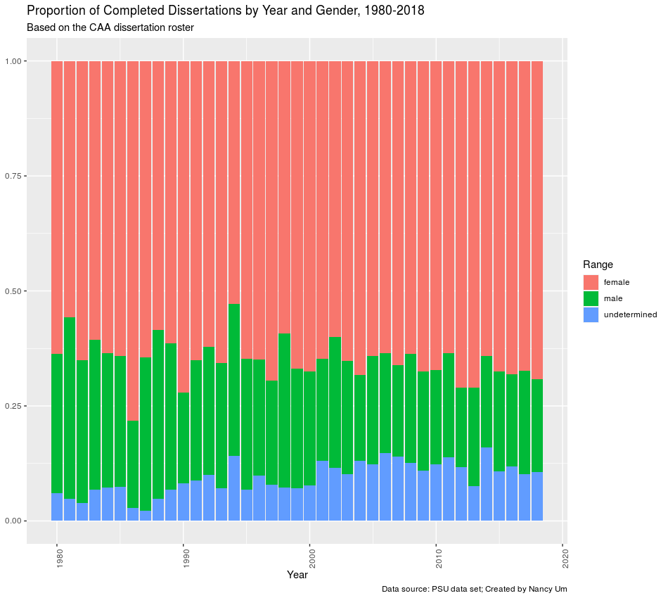 Fig. 3 Proportion of Completed Dissertations by Year and Gender, 1980–2018, Based on the CAA Dissertation Roster and the PSU Data Set (created by Nancy Um; click for larger version)