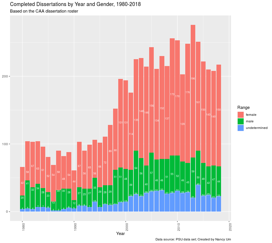 Fig. 2 Completed Dissertations by Year and Gender, 1980–2018, Based on the CAA Dissertation Roster and the PSU Data Set (created by Nancy Um; click for larger version)