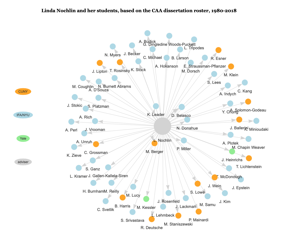 Fig. 7 Linda Nochlin and Her Students, Based on the CAA Dissertation Roster, 1980–2018, and the PSU Data Set (created by Nancy Um with visNetwork; click for interactive version, where you can scroll to zoom in or out/click and drag to rearrange the nodes)