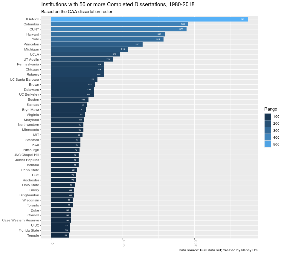 That article generated a considerable amount of interest, suggesting that art historians across the discipline are eager to learn more about the shifting shape of the field and are not averse to pursuing the language of descriptive statistics as one possible approach. It also inspired this follow-up essay and another forthcoming one, both commissioned as installments to appear in a series in caa.reviews. All three use the CAA dissertation roster as a salient point of departure and are committed to data-inflected practices of analysis. All are similarly poised at a temporal pivot, with the claim that we must look back to move forward and that understanding our past will help us to sketch the possibilities for the future of our field at a time of great uncertainty.