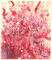 The most recently completed work in this exhibition, the fragile Untitled (2004), was displayed behind glass because it was created using beet juice along with colored pencil, foil, and pigment. The paper surface is nearly covered with swipes of color, swirls, striped circles, and repeating patterns of lines, with a small white circle placed slightly left of center serving as a focal point amid the wash of fluid, beet-colored shapes. Except for the pure white circle, the imagery overlaps and fades in and out, corresponding to the contemplation of impermanence implied by the use of the beet juice alongside the more traditional art materials.